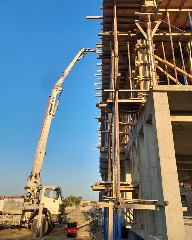 На объекте подрядчики поднимают стены и каркас второго блока, занимаются установкой и подключением водяных резервуаров, а также монтируют инженерные системы.