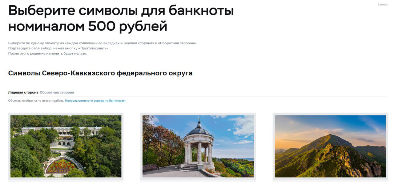 Каждому участнику голосования предстоит выбрать два символа: один для лицевой стороны банкноты – из достопримечательностей Пятигорска; один для оборотной – из объектов регионов Северо-Кавказского федерального округа.