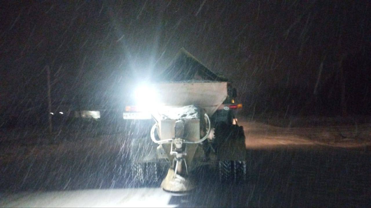 Проводится расчистка дорог от снега и обработка противогололёдными материалами. Водителей просят соблюдать осторожность, по возможности отказаться от ночных поездок и не выезжать на дороги на летних шинах.