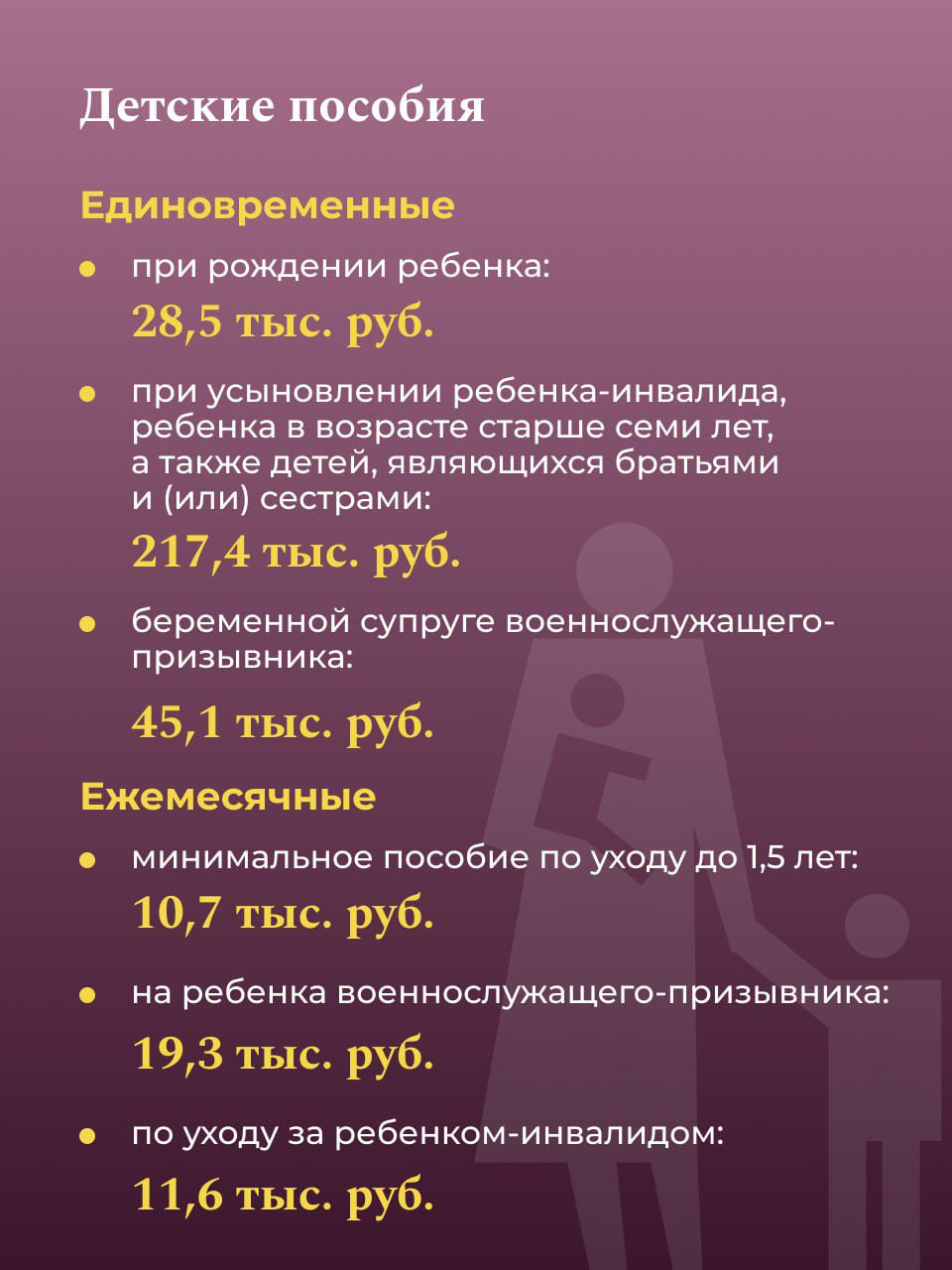 Повышение коснется материнского капитала, выплат ветеранам и людям с инвалидностью, пособий по уходу за ребенком, страховых выплат и других мер поддержки граждан.